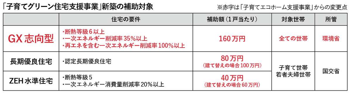 また、これまで新築は子育て世帯または若者夫婦世帯に限定していたが、GX志向型では世帯要件を撤廃する。国交省所管で実施する認定長期優良住宅やZEH水準住宅への支援は、引き続き子育て世帯・若者夫婦世帯が対象で、補助額は長期優良住宅が80万円/戸、ZEH水準が40万円/戸。建て替えの場合は、20万円加算される。